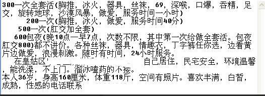 [xinxitop]提示信息[/xinxitop] 【寻欢时间】:2019年11月21日 【寻欢地点】:辽宁、沈阳(皇姑区中医院附近) 【信息来源】:狼友推荐、论坛、亲身体验 【服务项目】:鸳鸯浴,漫游,胸推,69式,冰火,口活,爱爱、器具,旋转地球,沙漠风暴,肛交(可选,勿必填写真实服务项目) 【妹妹数量】:1 【环境设备】:小区住宅 【营业时间】:全天 【价格一览】:200/次或300/全活或600包夜等 【安全评估】:98。 【服务星级】:★★★★★ 【重点推荐】:最值得推荐的地方以供参考 【联系方式】:[unfree]QQ:1978153158 手机:13514261318[/unfree] 【寻欢细节】:最近老喜欢熟女了,特点就是那口技一流可以口爆出来的技术,很强。喜欢口爆的朋友可以去试试。在做爱的姿势和做爱感觉她比我这个小狼都懂。真是不用指挥,自己享受就行了。年轻控和颜值控就不要去了(可以肛交,但是很丰满,耐操),喜欢成熟女性值得推荐,已经徐娘半老,自然别指望身材啥的和嫩气妹子比,阴部肉多,木有异味,懂风情,会夹,第一次直接夹得缴枪,屄耐肏,背枪尤其爽,而且也不贵,绝对适合泄火。有想玩得开爽爆了的更是不二选择 【附带照片】: 【验证截图】: