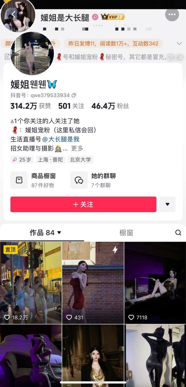 曝光女主是来自抖音上面一个拥有着 46W 粉丝的擦边网红