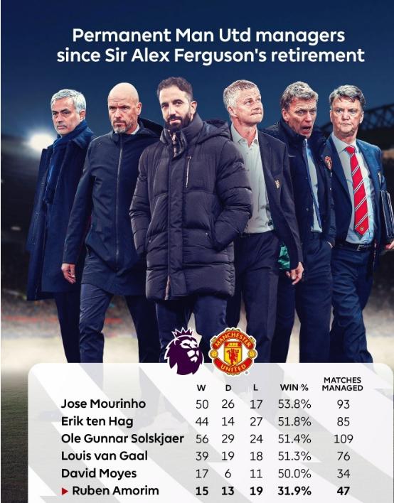 [|热帖精选] 英超官方晒图对比弗格森后曼联各主帅胜率 阿莫林31.9%排垫底 |