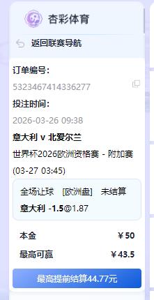 [|足球赛事] 【实战推荐】3月25日欧洲预选 03:45 意大利 VS北爱尔兰推意大利赢盘 |