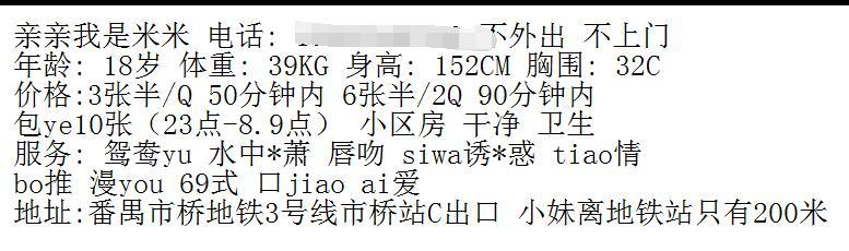 标题没有写联系成功的帖子请谨慎购买,不一定能联系成功的,先钱不可信 【寻欢时间】:2016年11月 【寻欢地点】:广州 【信息来源】:网络 【服务项目】:很多 【妹妹数量】:没问 【环境设备】:该有都有 【营业时间】:这个需要自己问 【价格一览】:300 【安全评估】:不去最安全 【服务星级】:70 【重点推荐】:前段时间患了流感,休息好多天了,近日痊愈,一颗蠢蠢欲动的心又开始痒痒的了,本来打算去广州的,虽然大广州的地铁虽然方便,但也是各各远,最后决定还是在番禺就地取材好了,最近在一个Q群里加了一个番禺的MM叫米米,看起来好像还不错,就她了。在QQ里约好时间,问好地址,很近,直接杀到市桥C出口200左右的一个小区里,在MM的指挥下上楼,到了门口,妹子已经开门等了,观察了一下,年纪确实不算大,二十多的样子吧,皮肤有点黑,身材还过得去,妹子的消费是350一Q五十分钟内,650两Q90分钟内,我选择的是一Q,抱着先试一下先的心态,如果感觉不错,下次就玩两Q。好了入正题,两个全身脱光光去浴室,鸳鸯浴开始了,惊喜的是,居然还有水中萧,虽然时间不长,但好过无。洗干净后进入炮房,躺在床上开始服务了,其中妹子问了一下需要丝袜不,我不好这口,喜欢脱光光干,嘿嘿..........接下来服务开始了,波推,漫游 69 蚂蚁上树等来了,口交技术还不错,至少没觉得有什么齿感,一番服务下来后,开始带主TT正式插入了,首先是女上式,几十回合后换小狼进攻了,小狼二话不说先来一阵猛插,妹子的呻吟声开始大了,换了几个姿势后,最后还是在喜欢的后入式中交待了.......... 【总体评价】:米米MM长得还算过得去,真人皮略黑,但弹性不错,波波不算大,32C的样子吧,BB也不算黑,应该没有出来做多久。年纪也不大,价格也比较合适,番禺不比广州,资源相对要少一点,市桥附近的狼友不想跑远又觉得合适的可以试一试。以上仅代表个人体验观点,不喜欢可以喷,无所谓,本人非枪手,没有任何利益关系,只是偶尔去光顾一下自己感觉喜欢的妹子,喷了不痛不痒。图片来自QQ空间。 【联系方式】: